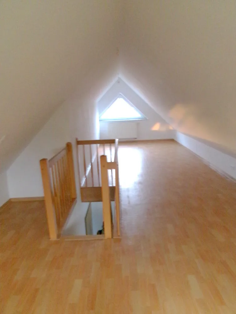 - Wohnung rechts 68qm und ebenfalls zusätzlich ein ausgebauter, 32qm großer Spitzboden mit Dreieck-Fenstern. Eine feste Treppe, wie sie in der linken Wohneinheit bereits besteht, kann nachträglich eingebaut werden.