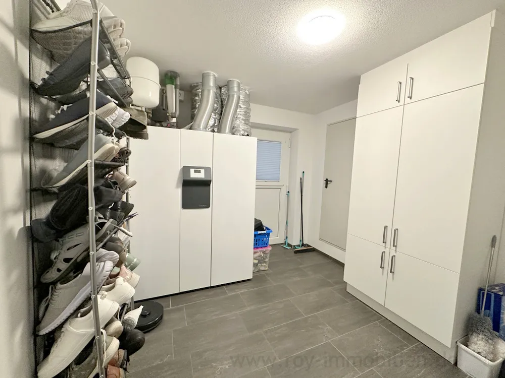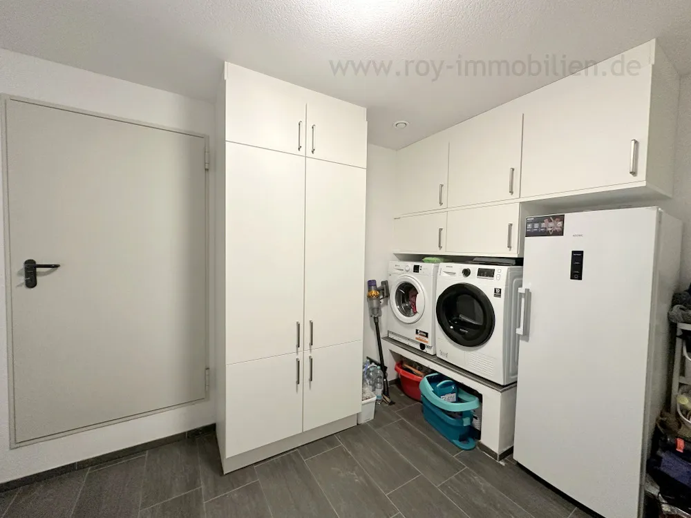 Der große Hauswirtschaftsraum bietet sehr viel Stellfläche und verfügt über diverse Einbauschränke, Waschmaschine und Trockner in Arbeitshöhe. Hier befindet sich auch die komplette Haustechnik.