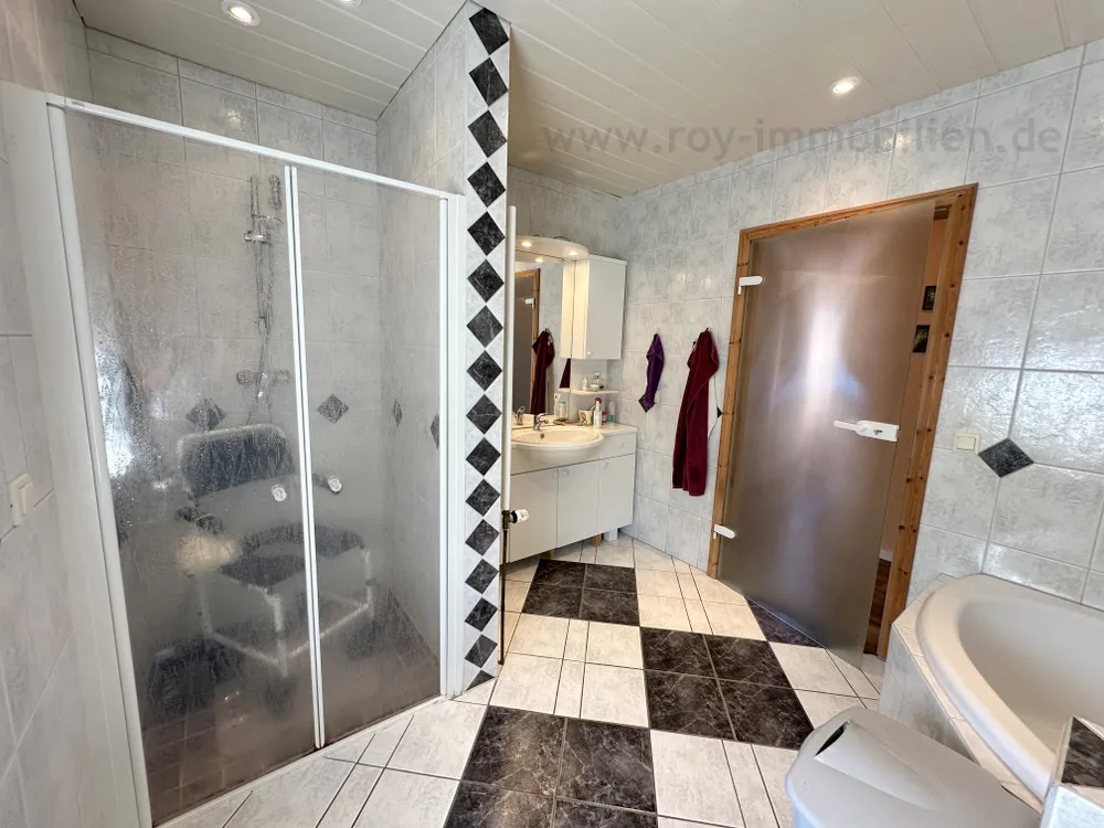 Das moderne, neuwertige Badezimmer ist ausgestattet mit einer Eck-Badewanne, bodentiefer XXL-Dusche, Waschtisch und WC und verfügt über Fußbodenerwärmung.