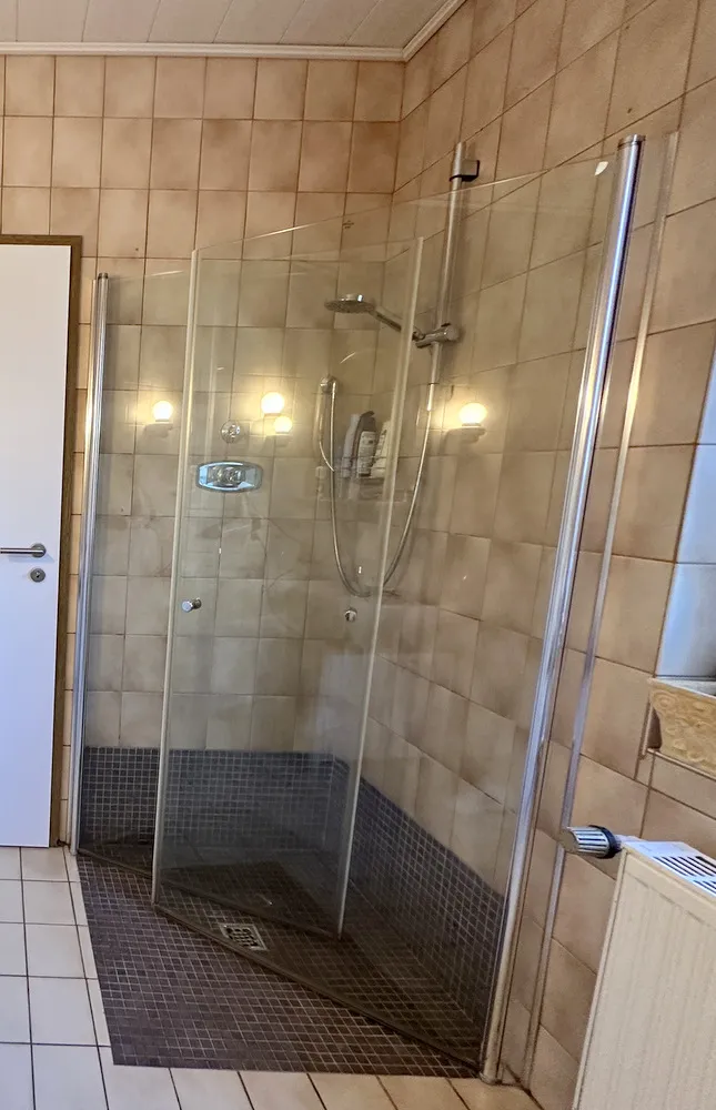 Das 2. Badezimmer ist mit bodentiefer XXL-Dusche, Waschtisch und WC ausgestattet.