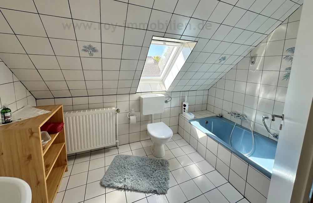 Das Badezimmer ist mit Badewanne, Waschtisch, WC ausgestattet und ist bis zur Decke weiß gefliest