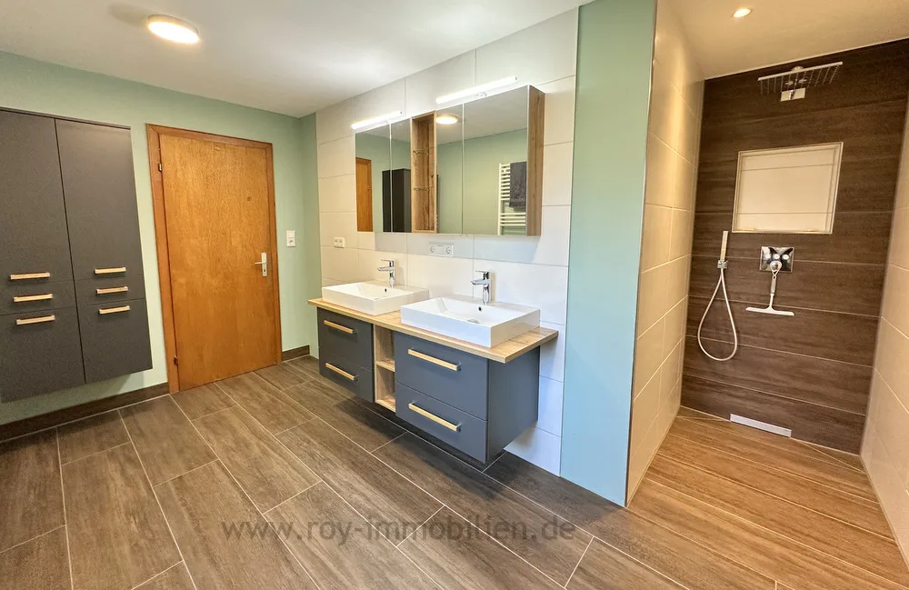 Es verfügt über eine bodentiefe Dusche, Handtuchtrockner, Doppelwaschtisch und WC. Bodenfliesen in Holzoptik, warme Farben und moderne Badmöbel sorgen für eine angenehme Wohlfühlatmosphäre.