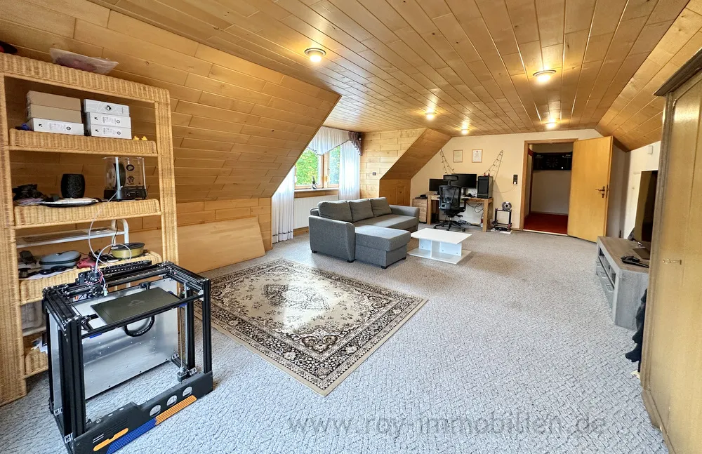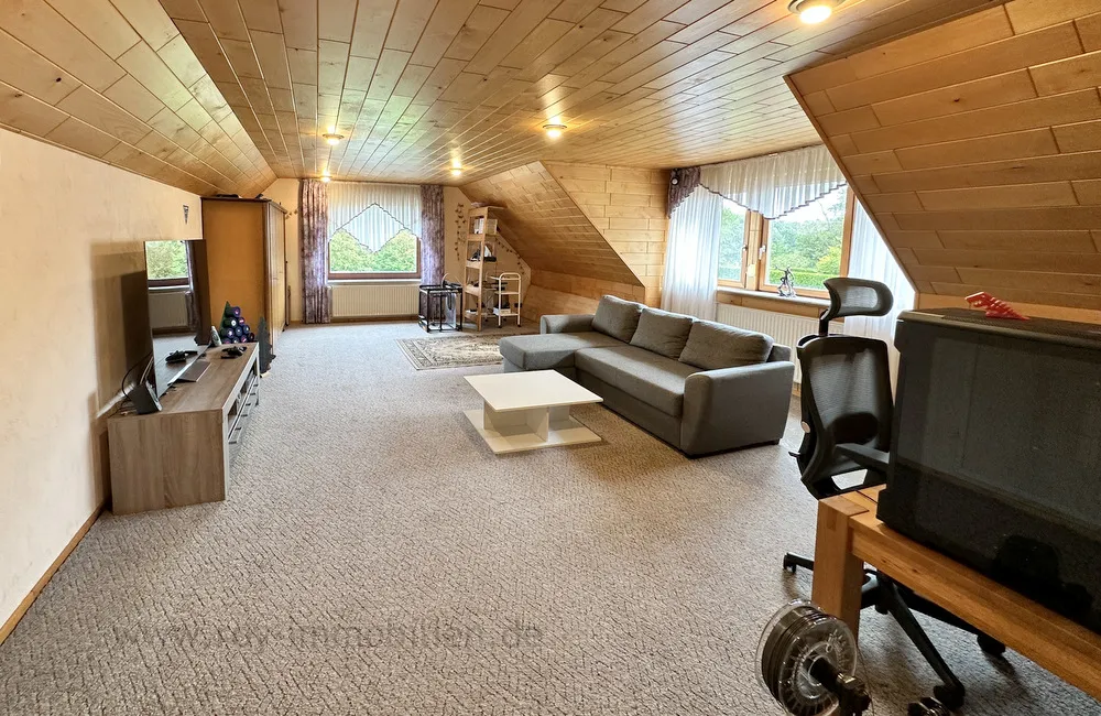 Das geräumige Wohnzimmer ist als Studio unter dem Giebel der rückwärtigen Seite des Hauses ausgebaut.