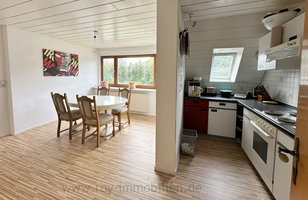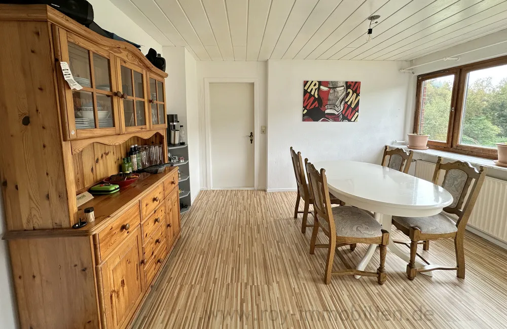Das Wohn-Esszimmer ist mit einem breiten, offenen Durchgang unterbrochen. Die Küche ist von hier mit wenigen Schritten über den Flur erreichbar. Die Küche ist mit einer modernen, weißen Einbauküche ausgestattet, verfügt über TV-Anschluss und bietet Platz für die Essgruppe direkt am Fenster.