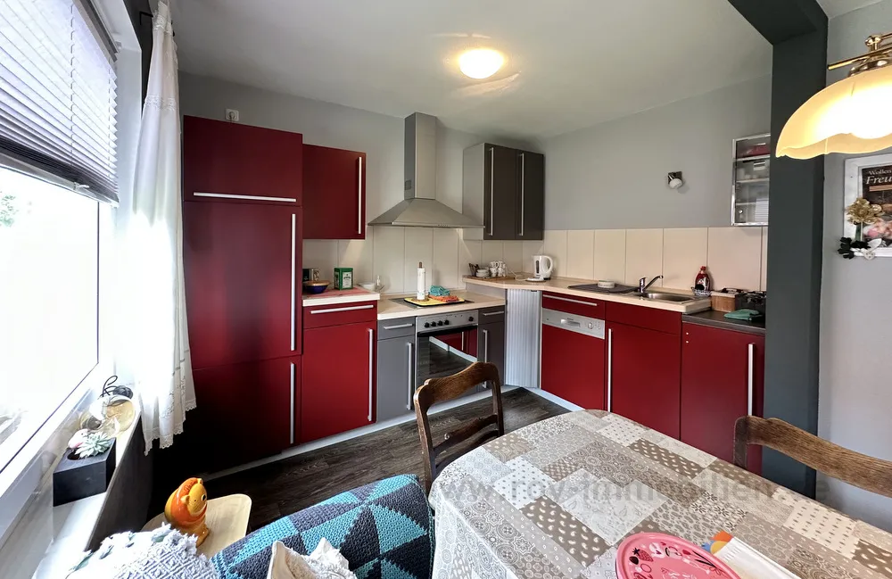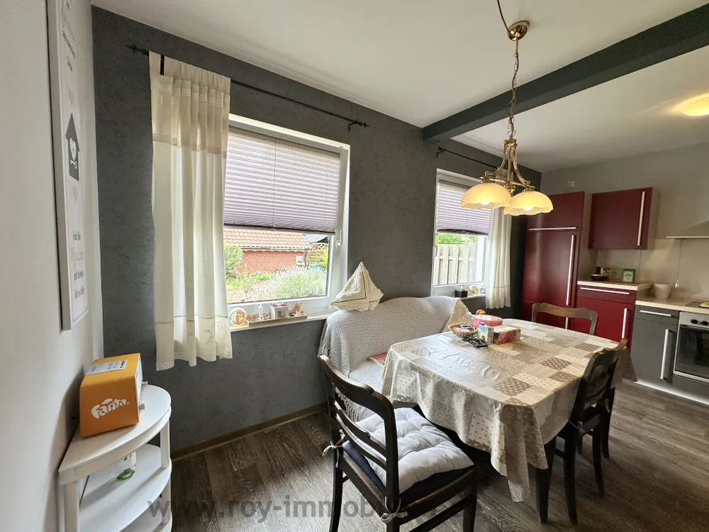 Der Koch-Essbereich ist mit einer Einbauküche ausgestattet und bietet viel Platz für den Familientisch direkt am Fenster.