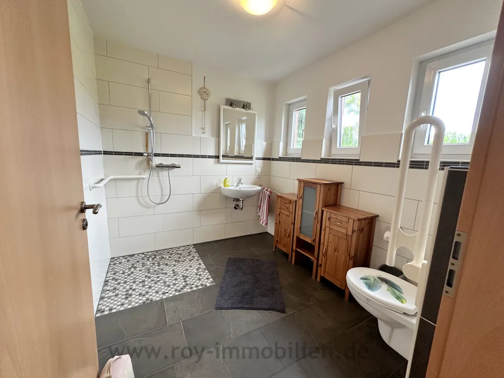 Das modernisierte Badezimmer verfügt über eine bodentiefe Dusche, WC und Waschtisch und ist wie alle Räume im Haus mit Fußbodenheizung ausgestattet.