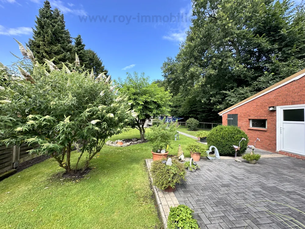 Der Garten ist rundherum mit Hecken, Holzzäunen und altem Baum- und Strauchbestand sichtgeschütz.
