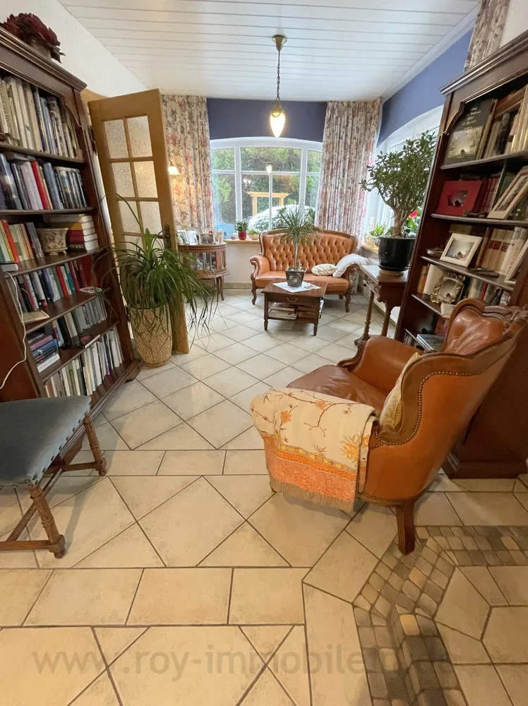Mit offenem Durchgang unterbrochen, gelangen Sie von hier in ein Lesezimmer. Große Rundbogenfenster von 2 Seiten gestalten auch dieses Zimmer hell und freundlich.