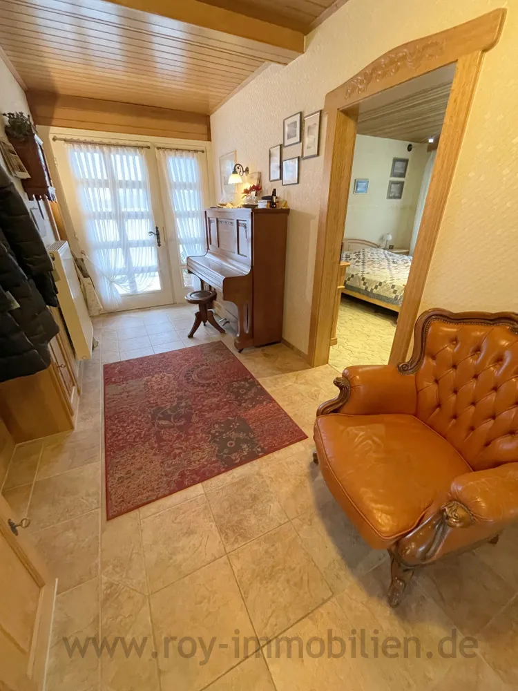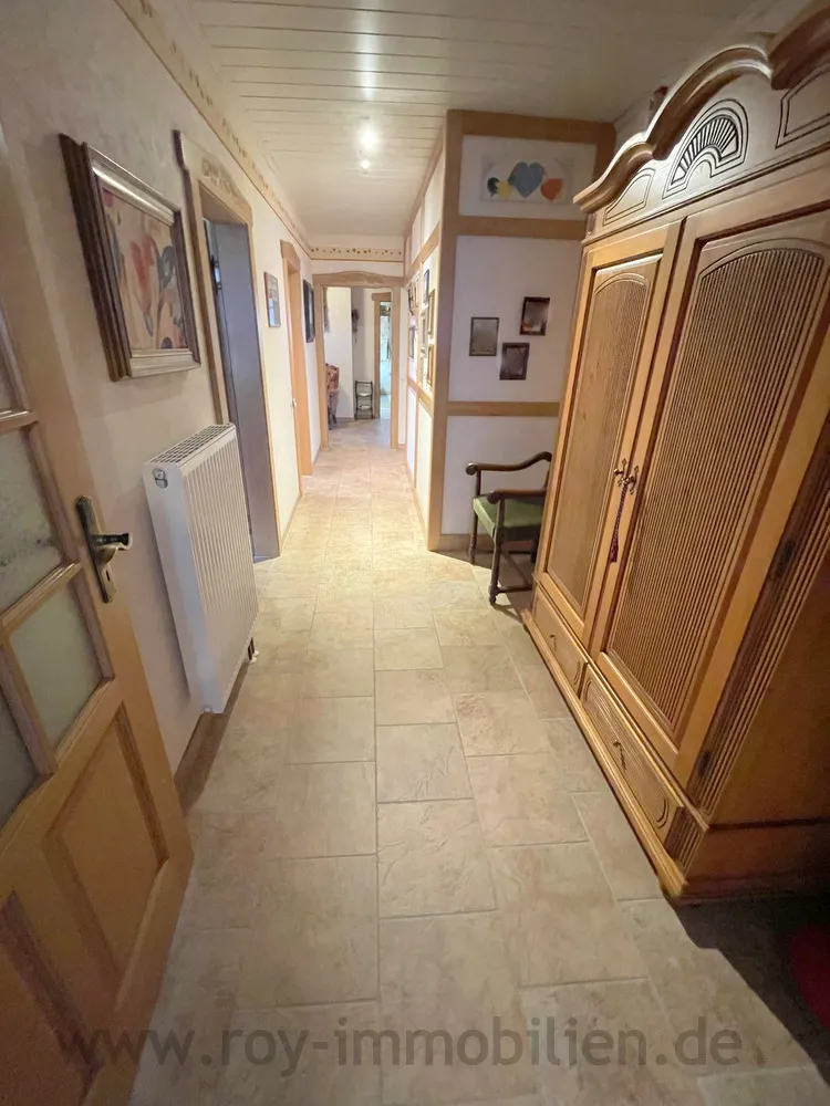 Über den Flur gelangen Sie zum hinteren Bereich des Hauses, wo ein zweiter Kaminofen für eine ideale Wärmeverteilung sorgt. In dem Zimmer am Ende des Flurs (Bügelzimmer) befindet sich der Treppenaufgang in das ausgebaute Dachgeschoss, sowie der Hintereingang. Bei Umbau des Dachgeschosses zur 2. Wohneinheit, ideal als separater Eingang nutzbar.