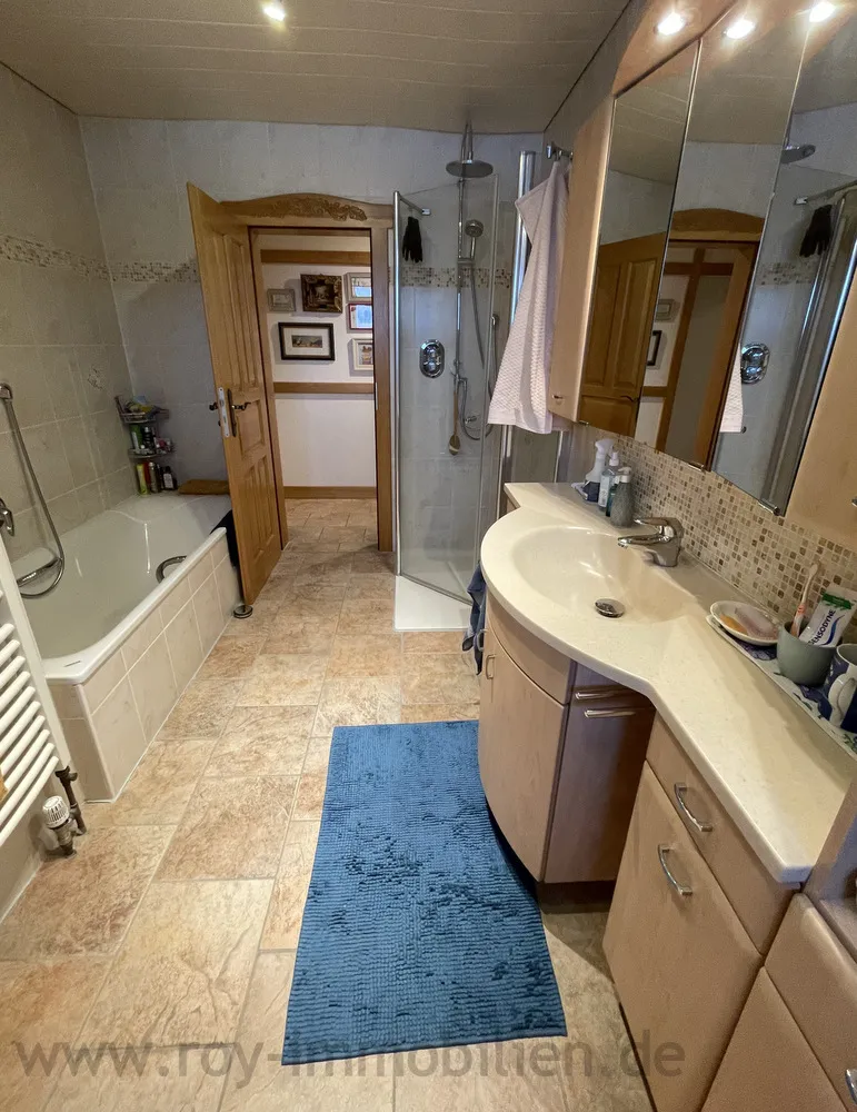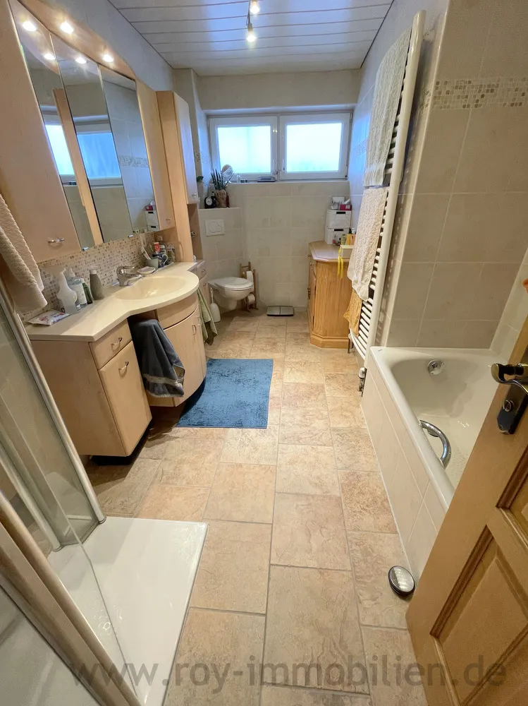 Das Badezimmer ist mit Badewanne, bodentiefer Dusche, Waschtisch, Handtuchtrockner und WC ausgestattet.