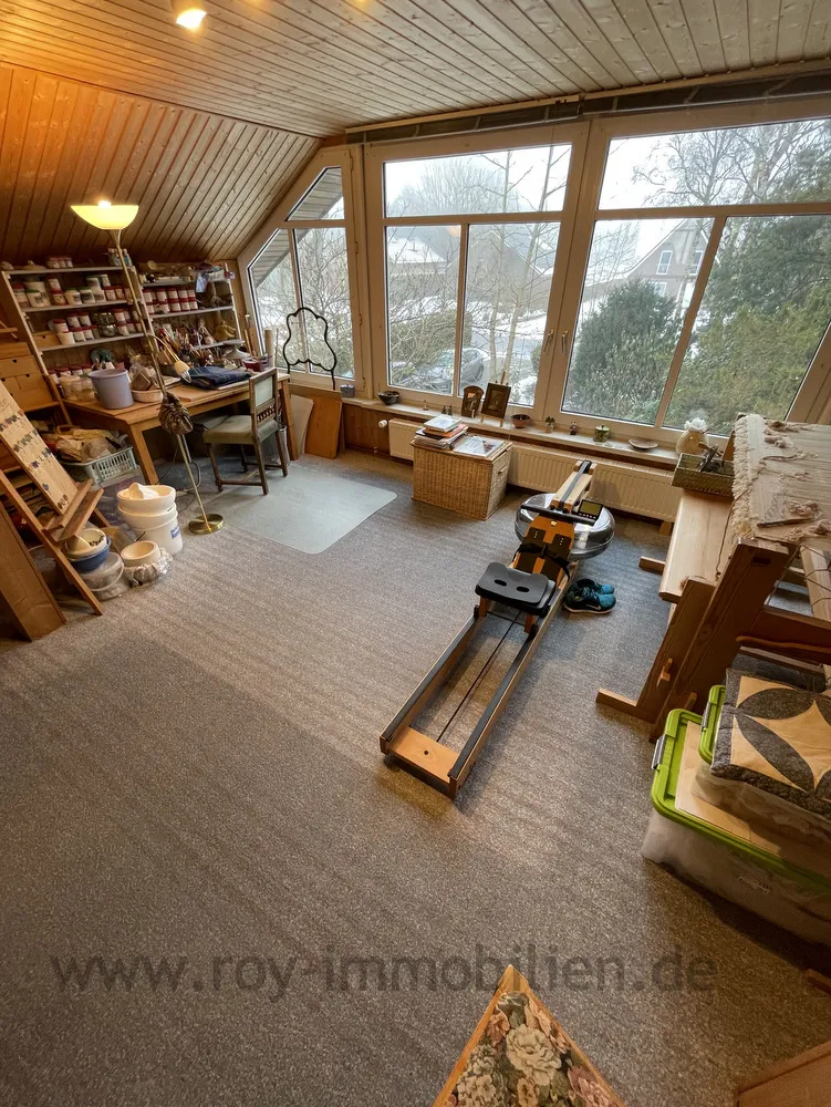 Das zweite Zimmer wurde als Studio ausgebaut und die komplette Giebelseite mit fast bodentiefer Fensterfront ausgestattet.