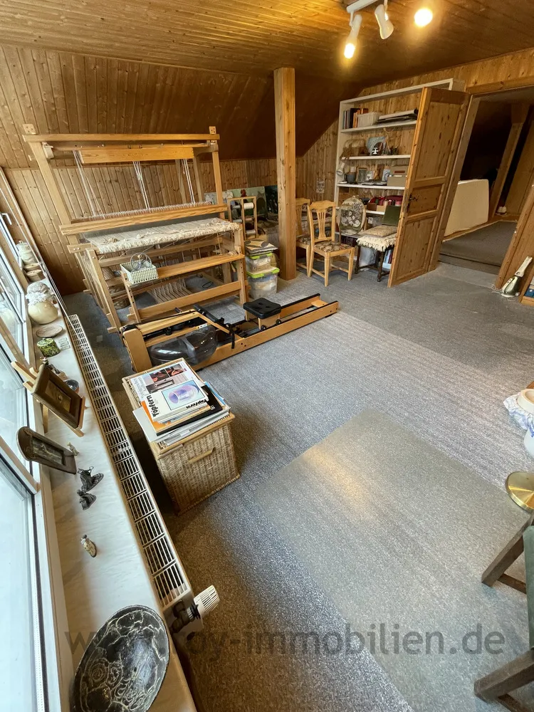 2 Zimmer unterschiedlicher Größe könnten zu einer 2. Wohneinheit ausgebaut werden. Rohre für ein Badezimmer sind schon gelegt. Die Zimmer sind geschmackvoll mit Holz ausgekleidet. Das größere Zimmer ist mit OSB-Platten ausgelegt, mit Dachfenster und Giebelfenster ausgestattet und bietet einen freien Blick auf Wiesen und Felder.